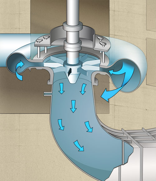 The water enters the runner radially (along all parts of the circumference) but it exits the runner axially as it free falls vertically away from the runner. The guide vanes are moveable, and within the turbine they are used to control the rate of flow which in turn controls the electrical output of the station. The station does not have to operate at full capacity every time the intake gate is opened.